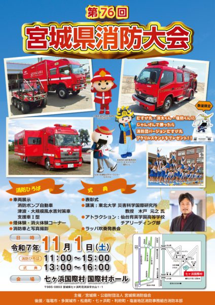 令和7年11月1日(土)七ヶ浜国際村国際村ホールセンターにおいて第76回宮城県消防大会を開催します。